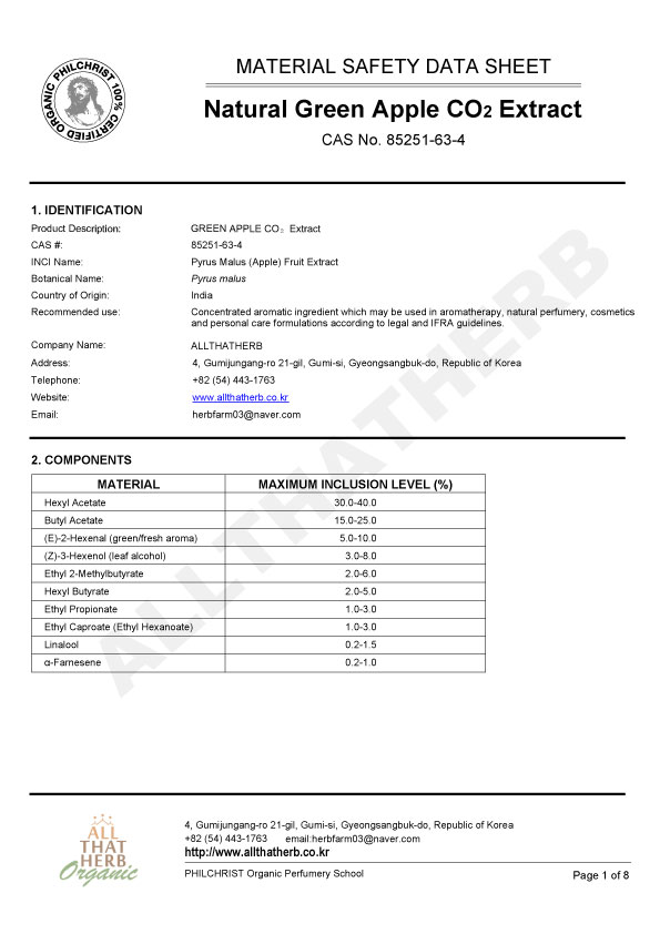 Botanical Name: Pyrus malus Note: Middle Note Part of the Plant: Fruit Peel / Fresh Apple Pomace Country of Origin: India Extraction Method: Supercritical CO©ü Extraction Aromas: Fresh, green, fruity, slightly tart with natural apple esters