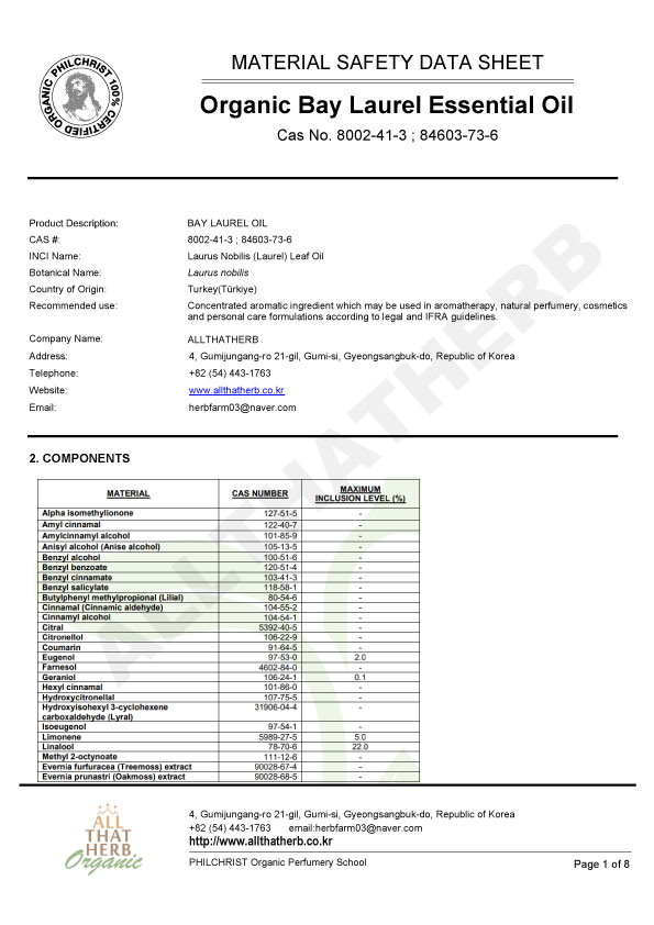Botanical Name: Laurus nobilis Note: Middle to Top Note Part of the Plant: Leaves Country of Origin: Turkey(Türkiye) Extraction Method: Steam Distilled Aromas: Strong, fragrant, and spicy aroma with woody and smoky undertones reminiscent of clove and star anise